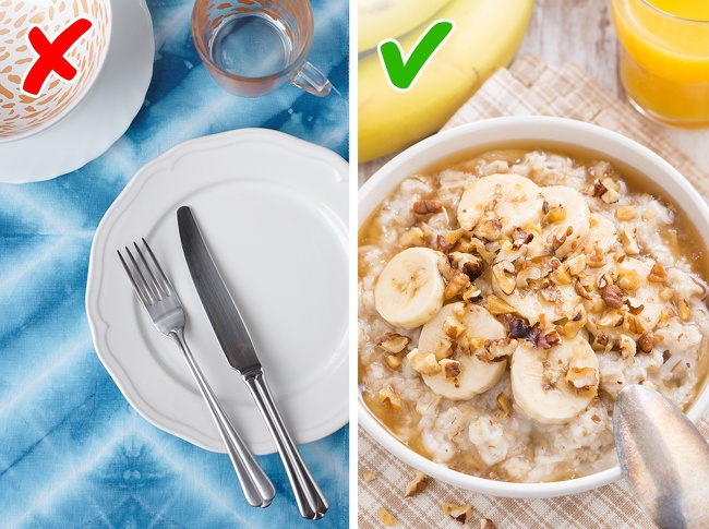 Do this instead: make sure you eat a healthy, nutrient-rich breakfast that will give you energy and prevent you from eating too much later. The perfect breakfast combines good carbs with fiber and protein — oatmeal, eggs, and Greek yogurt with fruit are all good healthy-breakfast options.