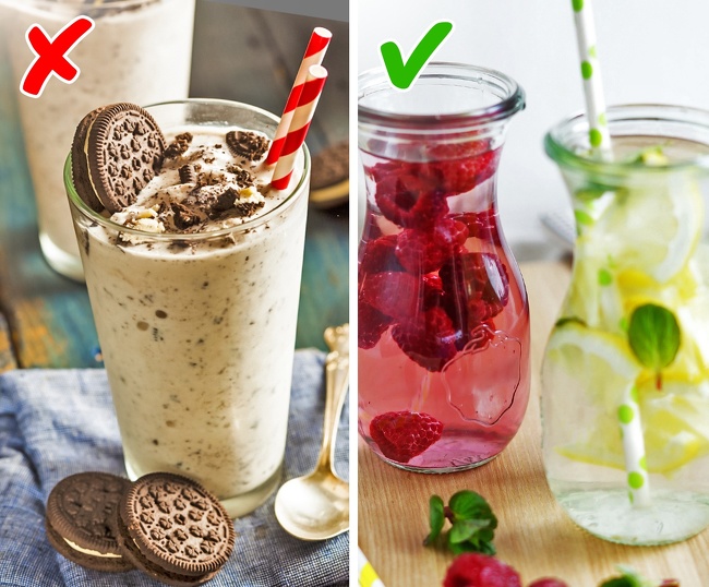 Do this instead: drink water! If you can’t stand the blandness of plain water, try adding lemon wedges, your favorite berries, or mint leaves to it to give it some taste. Unsweetened green tea is also a good beverage option.