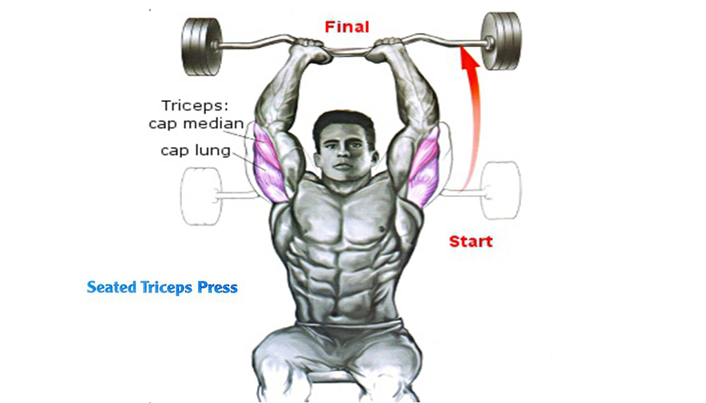 - Do 3 sets of seated triceps presses with the first set having 10 reps and the last two having 8 reps each.